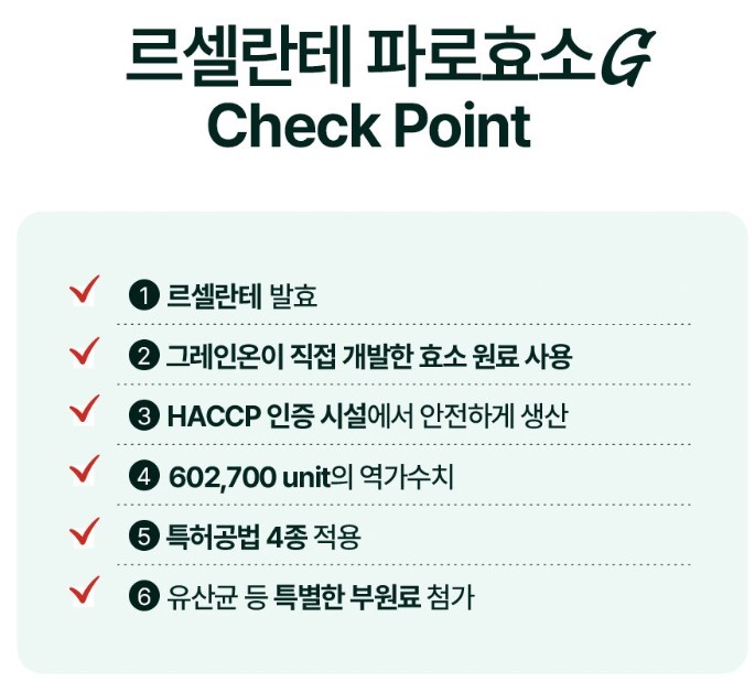 고대 곡물 전문 브랜드 그레이온은 국내 유일 고대 곡물 소재화 연구소를 보유하고 있는 기업으로 국내 효소 업계 1등 기업입니다. 2024년 올해의 브랜드 대상에서 올해의 효소로 선정돼 효소 부문 1위를 차지한 바 있습니다. 그레인온 르셀란테 파로효소는 이탈리아산 파로를 주원료로 사용하여 만든 효소 제품으로 소화불량, 복부 팽만감, 장 건강 증진 등 소화 기능 개선에 효능을 보이는 제품입니다.