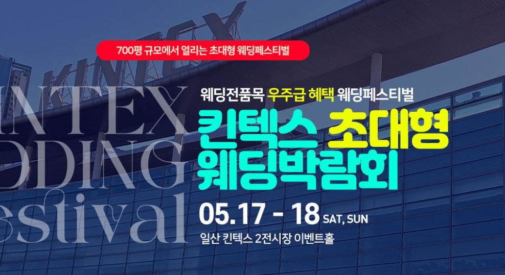 700평 규모의 초대형 웨딩페스티벌 일산 킨택스 초대형 웨딩박람회가 5월 17일부터 18일까지 일산 킨텍스 2전시장 이벤트홀에서 진행될 예정인데요, 이번 웨딩박람회에서는 웨딩홀, 스튜디오, 드레스, 메이크업, 예물, 신혼여행 등 결혼 준비에 필요한 모든 것을 직접 보고 비교하며 선택할 수 있습니다. 또한 박람회 기간 동안에만 제공되는 파격적인 할인 혜택과 계약 선물, 상담 선물 등 푸짐한 선물이 기다리고 있습니다. 행사일정은 다음과 같습니다.